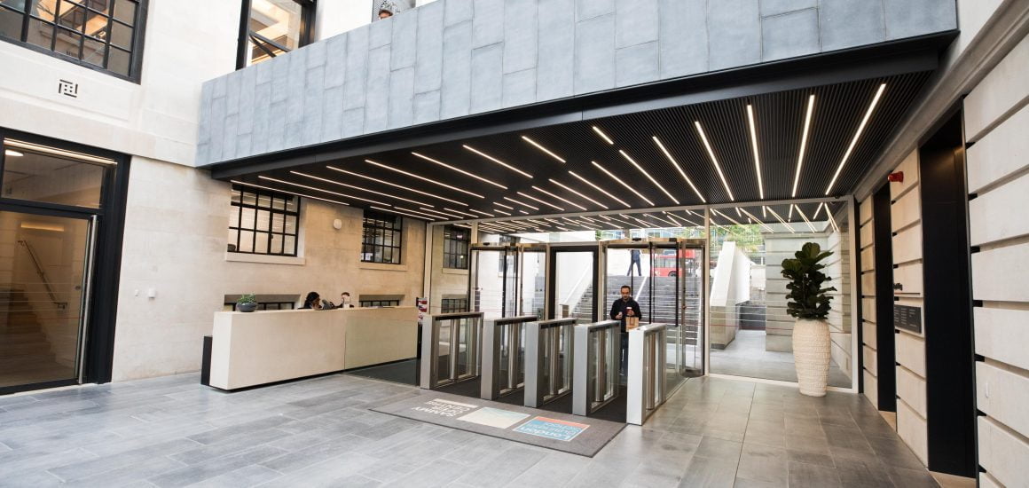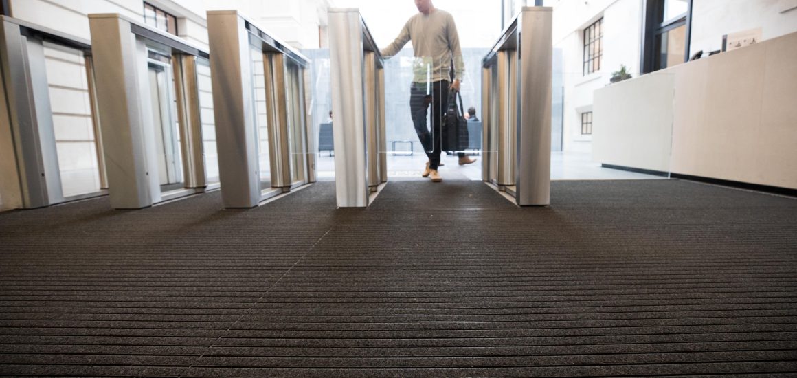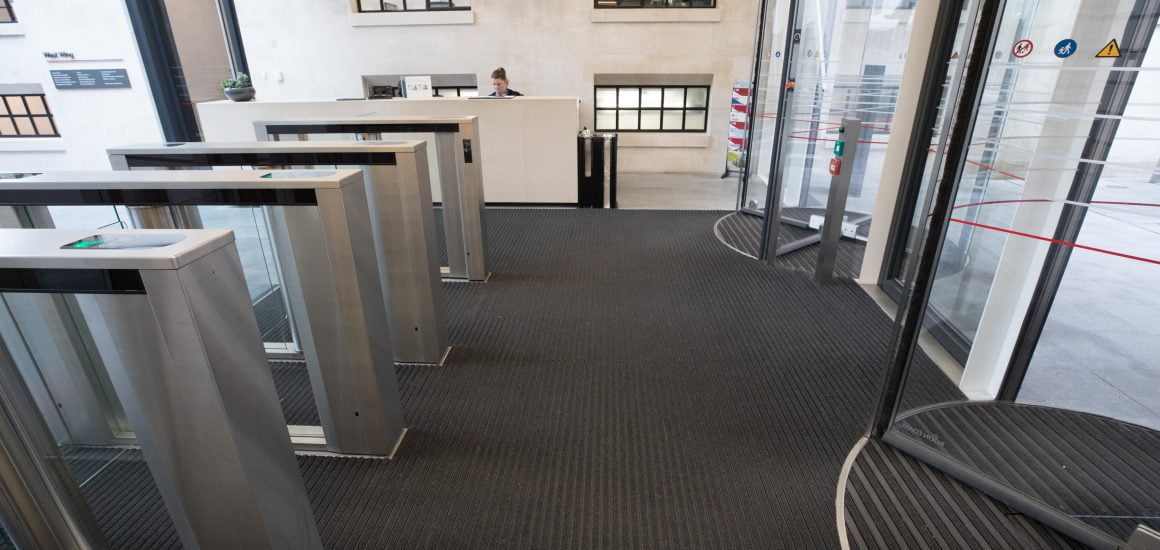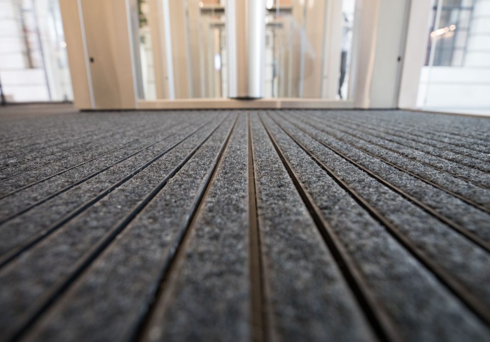 We are proud to have worked with the client to specify and install our flagship entrance matting system – INTRAflex XT – to prevent the ingress of dirt and moisture into the building. The aluminium system is black anodised to provide a simple, sophisticated aesthetic. INTRAflex XT as the name would suggest is a flexible system of aluminium planks and rubber connectors, suitable for heavy/extreme foot traffic.